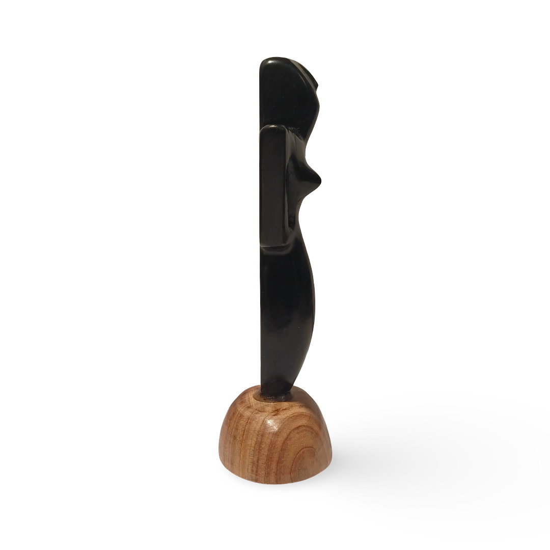 Statuetta della dea madre realizzata da monoblocco in Ossidiana con basamento in legno naturale