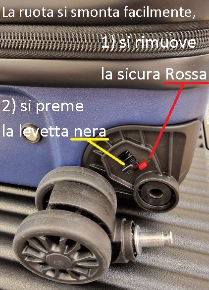 Ruote rimovibile per avere più spazio all’interno nel rispetto delle misure richieste dalle compagnie aeree